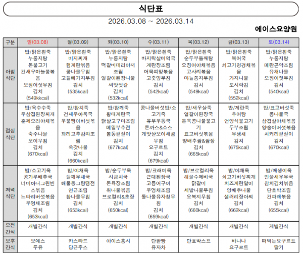 3월 2주 식단표 페이지 정보 작성자 최고관리자 댓글 0건 조회 10회 작성일 26-03-09 09:20 목록 본문 3월 2주 식단표 입니다. 이전글3월 3주 식단표 26.03.16 다음글3월 1주 식단표 26.03.03 댓글 0 댓글목록 등록된 댓글이 없습니다. 목록