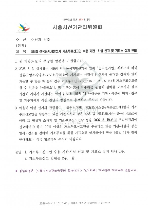 제9회 전국동시지방선거 거소투표신고인 수용기관, 시설신고 및 기표소 설치안내