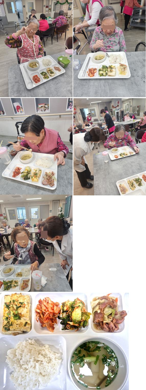 어르신들께서 고기와 국을 더 달라고 하시며 즐겁게 식사하셨습니다.