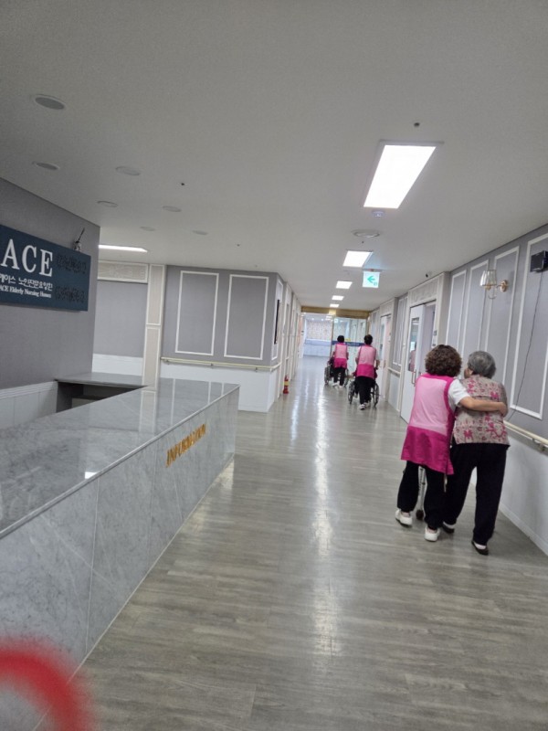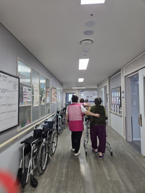 복도를 천천히 걸으며 담소를 나누니, 웃음꽃이 활짝 피었어요.