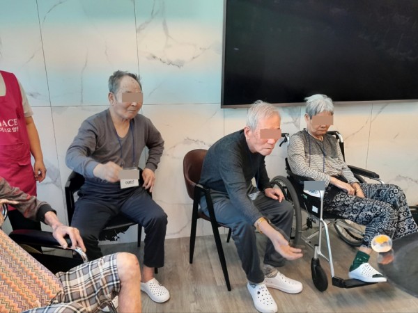 어르신들과 함께 손가락 펴기 운동으로 손 인지활동을 해보았습니다.