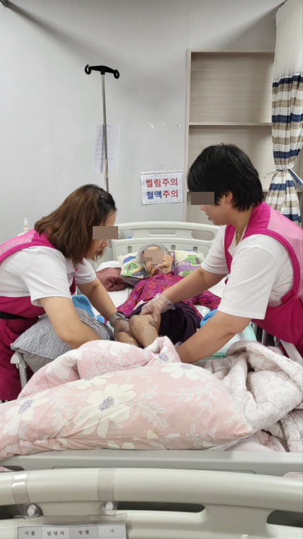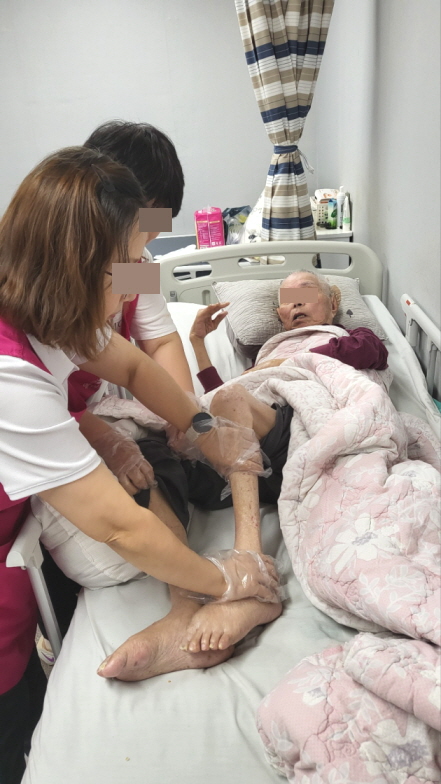 따뜻한 물수건으로 손과 다리를 닦아드리며 편안히 준비하셨습니다.