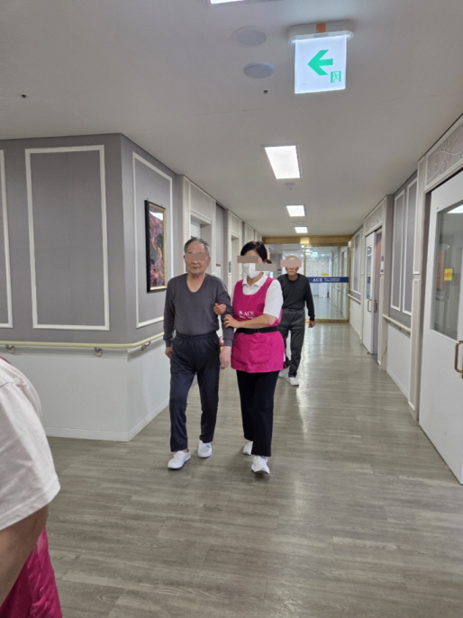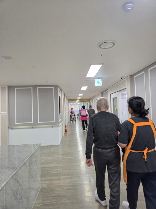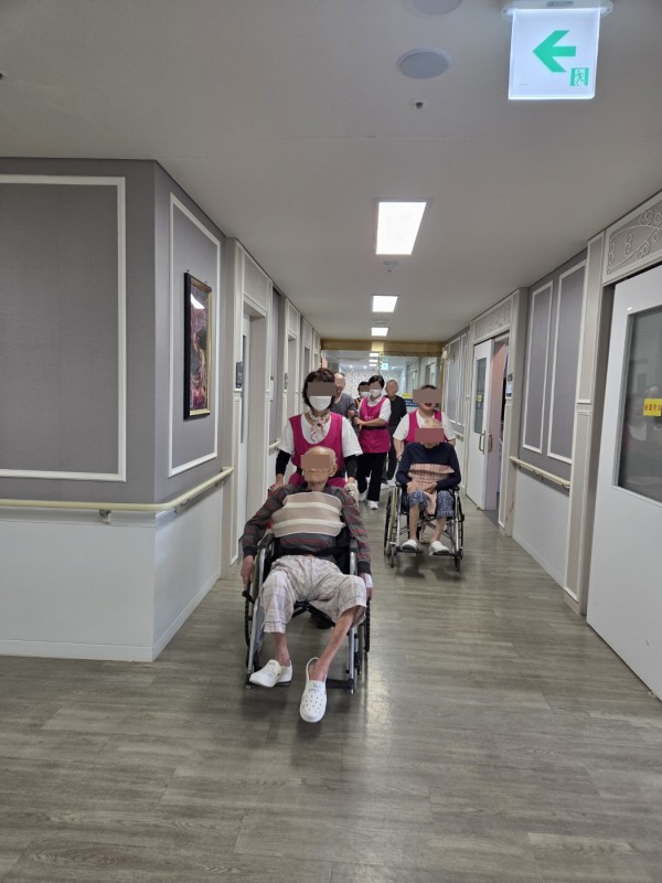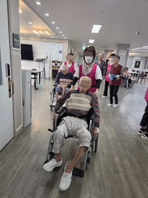 연두팀 어르신들께서 요양보호사 선생님의 부축을 받아 안전하게 원내 산책을 하셨습니다.
