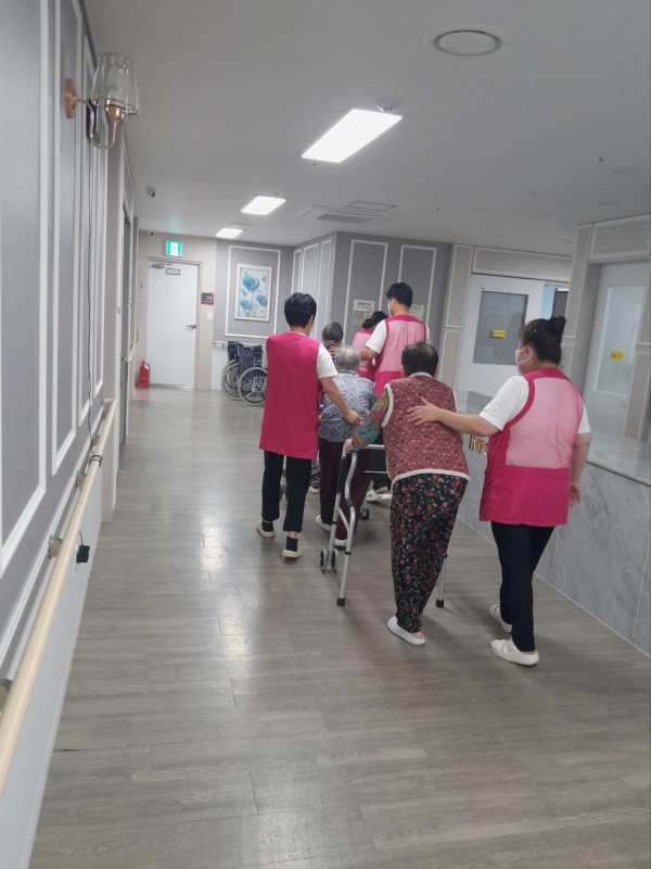 재밌는 이야기를 나누며 서로 격려하고 생활실 어르신들과도 이야기 나누며 걸으셨어요.