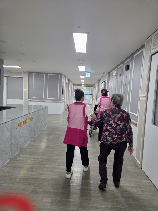 요양보호사 선생님들의 인도 아래 안전하게 원내 산책을 즐기고 계십니다.