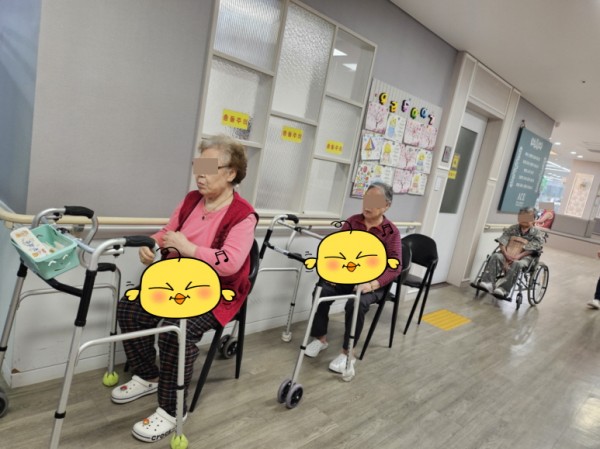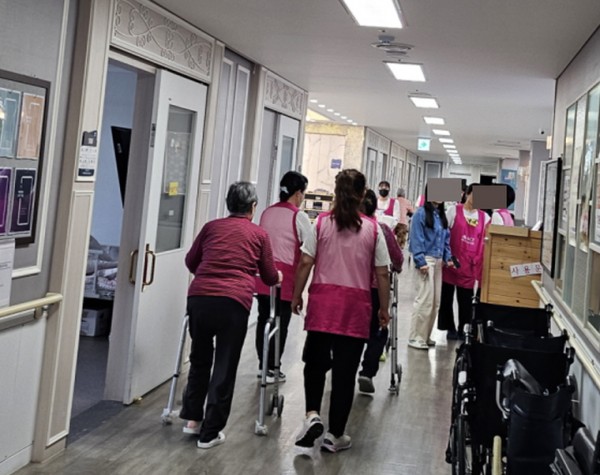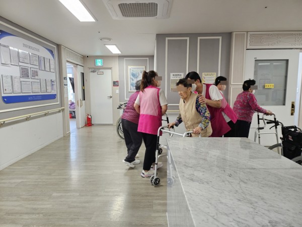 어르신들과 요양보호사 선생님들이 짝을 이루어 시설 곳곳을 함께 걸었습니다.