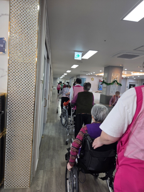 복도를 걸으며 친구 어르신께 인사도 건네고요.