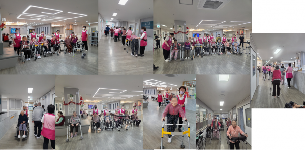 생활실 어르신들과 인사도 나누고 요양보호사 선생님과 짝을 지어 걸으셨습니다.