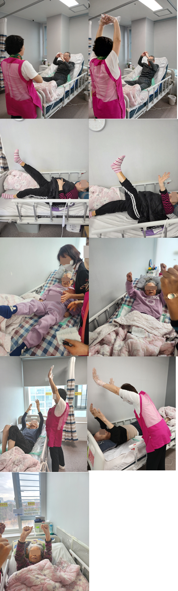 상지, 하지, 체간 운동을 순서대로 천천히 진행했어요.