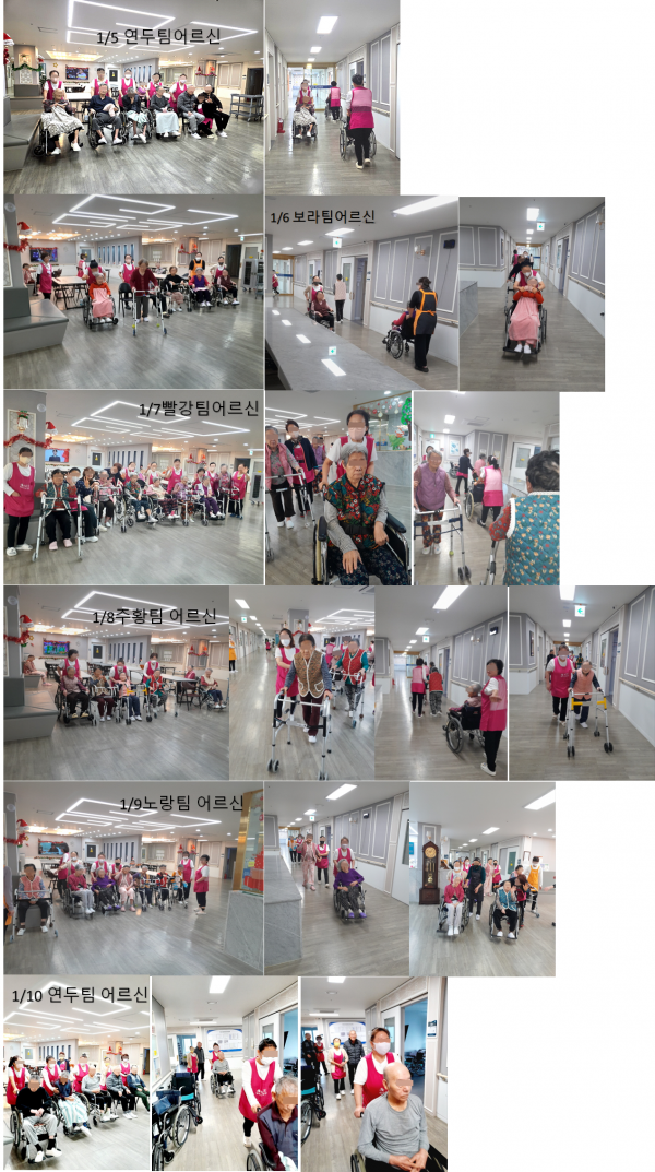 요양보호사 선생님의 보호를 받으며 천천히 열을 맞춰 복도를 한 바퀴 도십니다.