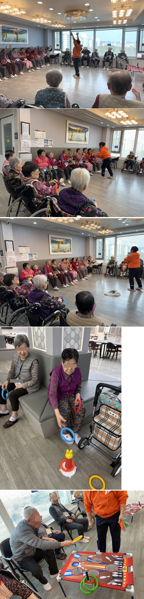어르신들과 구멍이 뚫린 판에 고리를 던져 합산 점수를 겨루는 링 볼링 활동을 진행했습니다.