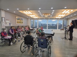 2주에 한 번, 목사님 방문으로 작은 콘서트가 열립니다. 목사님께서 어르신들이 좋아하시는 노래와 찬송가를 들려주시고, 따..